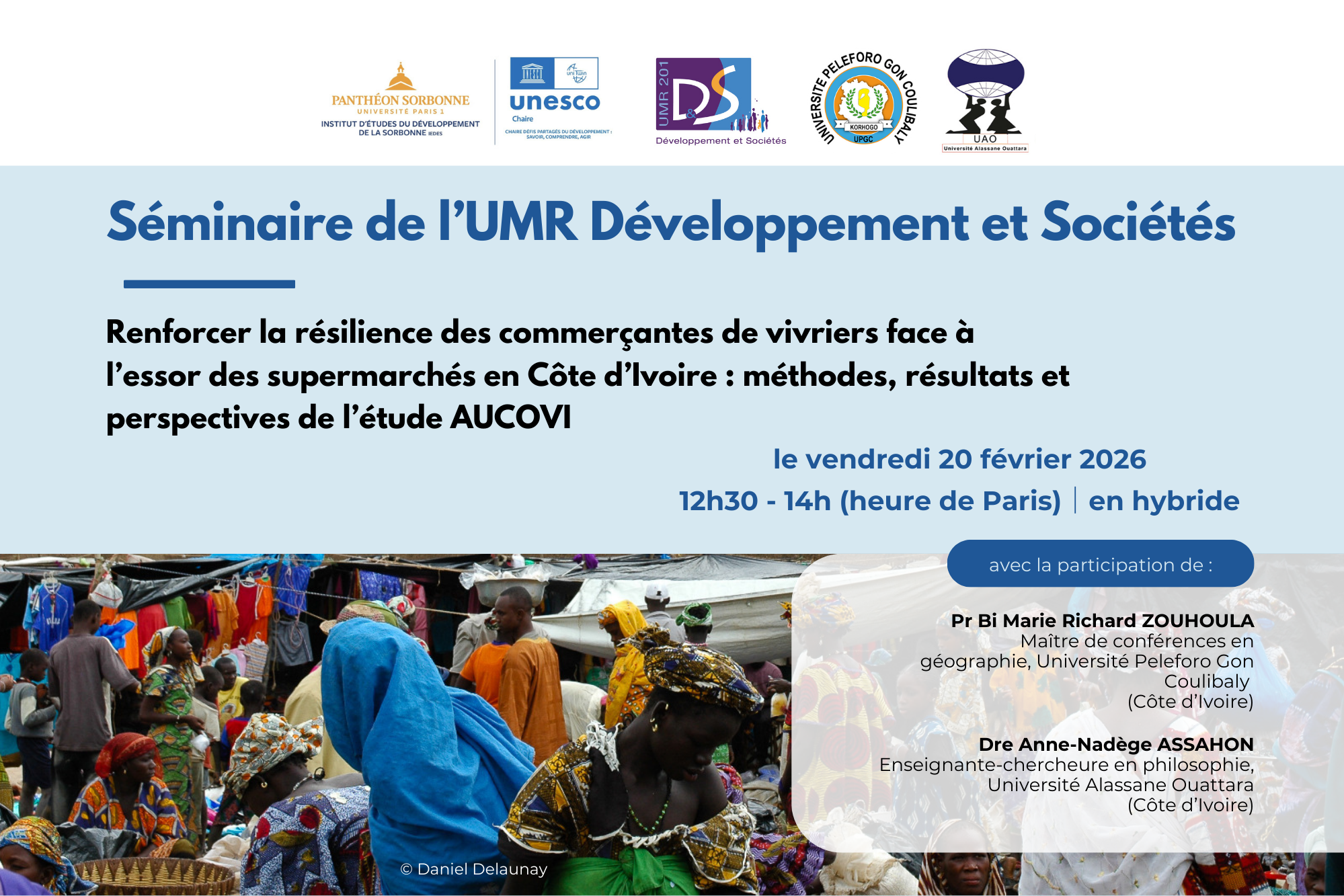 L’équipe de la Chaire UNESCO Défis partagés du développement : savoir, comprendre, agir, a le plaisir de vous convier au séminaire de l’UMR Développement et Sociétés intitulé : « Renforcer la résilience des commerçantes de vivriers face à l’essor des supermarchés en Côte d’Ivoire : méthodes, résultats et perspectives de l’étude AUCOVI ».